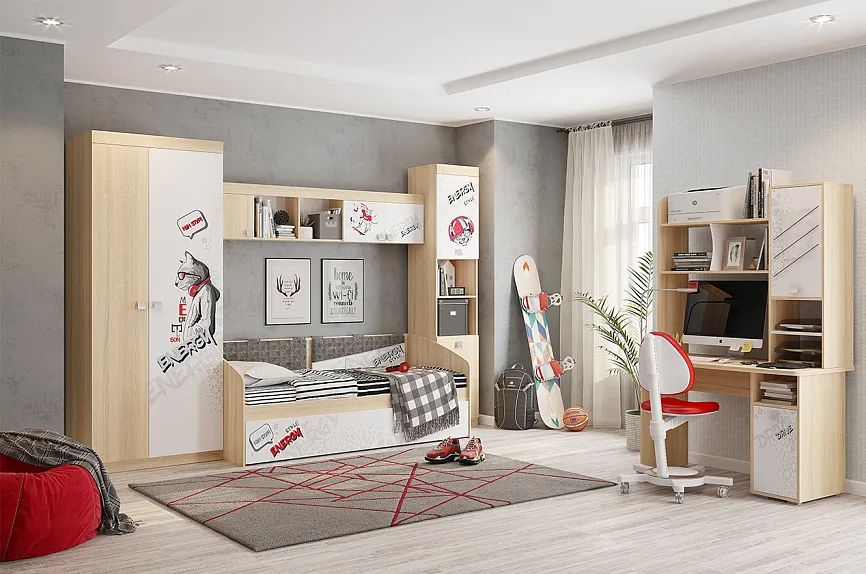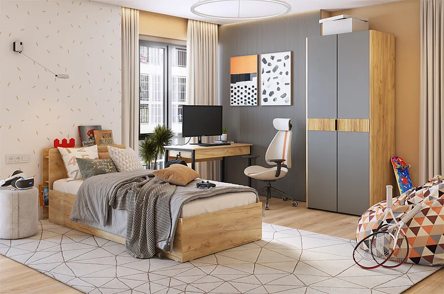 - Рабочая зона. Для школьников особенно важен выбор подходящего рабочего стола и комфортного стула, которые способствуют правильной осанке и повышают эффективность учебного процесса.