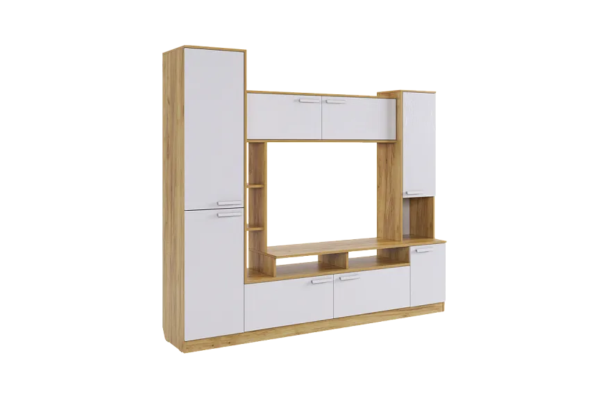 - При выборе стенок важно обратить внимание на их конструкцию и вместимость. Современные модели часто комплектуются закрытыми и открытыми полками, что позволяет комбинировать открытое и закрытое хранение.