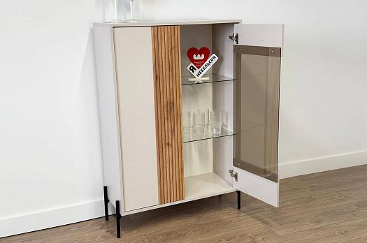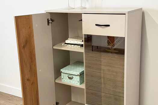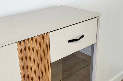 Другая сторона комода оснащена выкатным ящиком и фасадом со стеклом, обладающим зеркальным эффектом. Это не только добавляет современности и шарма, но и обеспечивает дополнительное пространство для хранения декоративных предметов и книг.